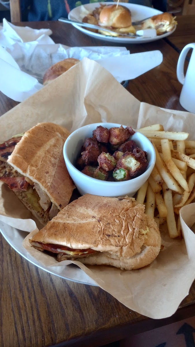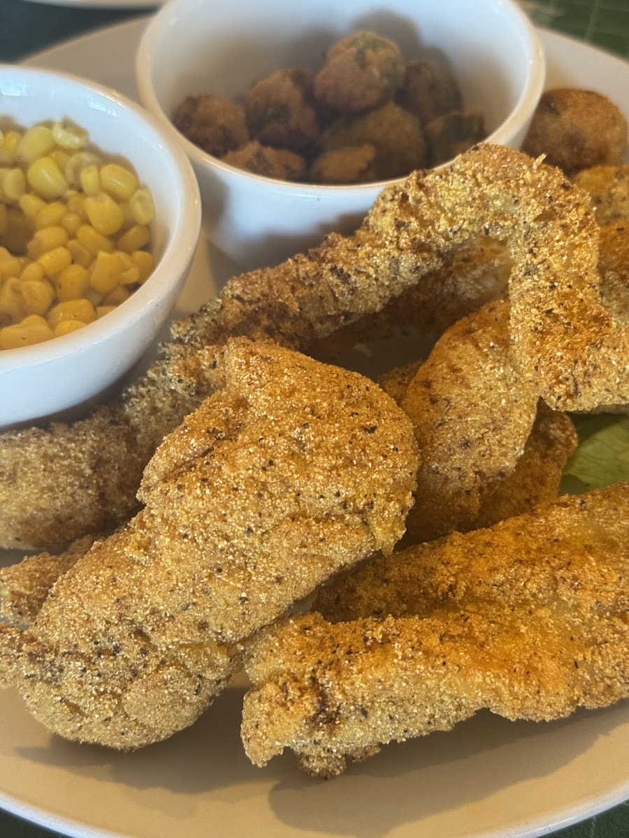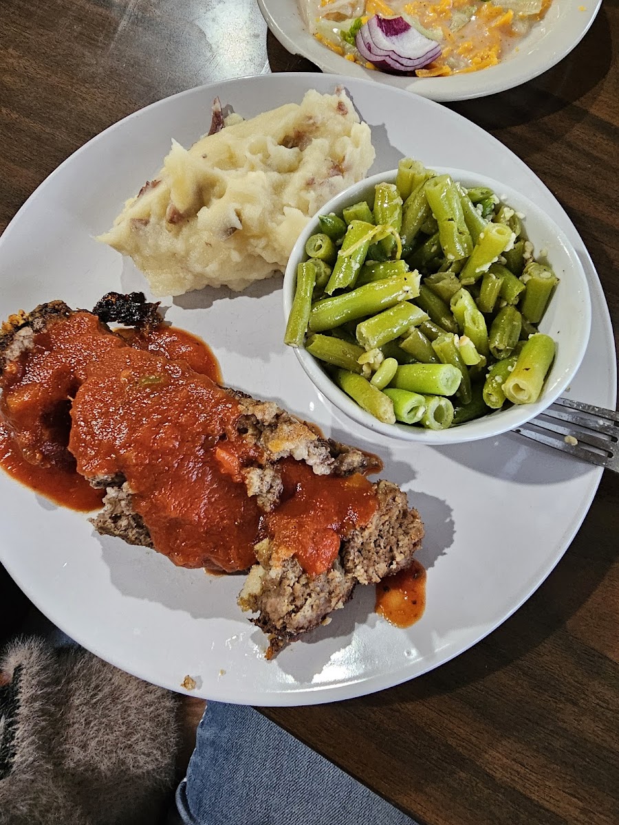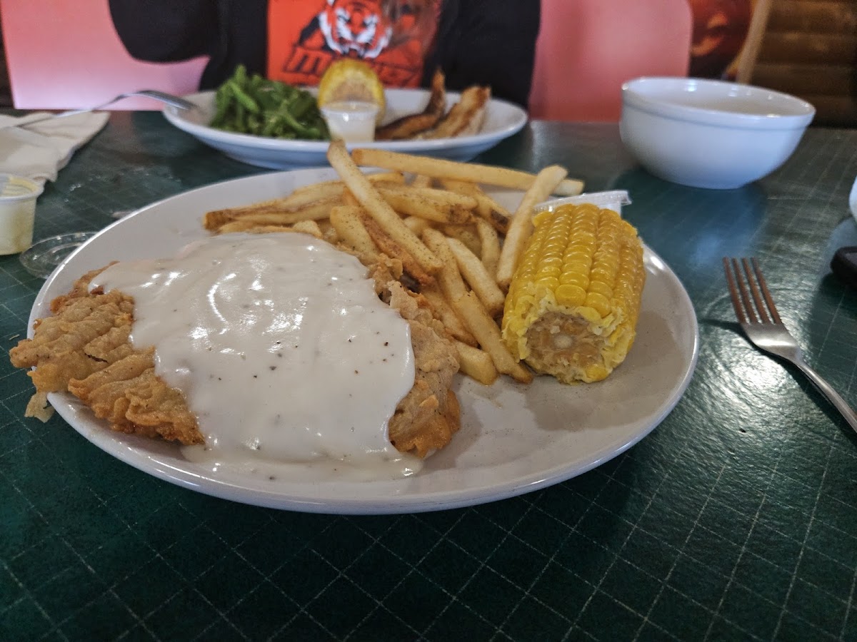 I got the American potato with chicken fried steak and it was a perfect portion. My granddad got the Loaded Mac and cheese, not only was it beautiful but decadent. My mom got the chicken fried chicken with onion rings and potatoes on the side. The fry was nice and crispy and the onion rings were mammoth. Large portions mean share or leftovers. Service is very friendly and accommodating. I definitely recommend, as a great option for some classic southern eats without excess grease and a menu option for everyone.